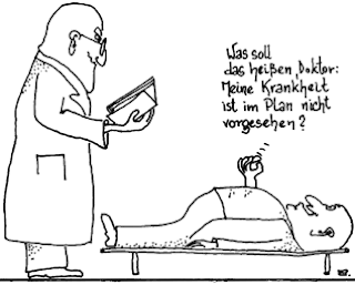 Strukturen sind in so einem Krankenhaus allgegenwärtig und sicherlich notwendig. Sie sollten allerdings auch immer wieder hinterfragt werden. Die Putzfrau zum Beispiel. Würde die bei mir zu Hause so putzen, würde ich sie hochkant rausschmeissen. Die automatisierten Bewegungsabläufe sind so sinnlos wie Frau Merkel als Kandidatin bei Germany´s next Topmodels. Jeden morgen werden die Patientenschränke mit genau 4,5 kreisenden Bewegungen abgewischt. Allerdings konsequent nur der erste und der zweite Schrank. Der dritte wird nie geputzt. Auch werden die Türgriffe nie gewischt. In einem Krankenhaus wohl nicht so wichtig. Bestimmt gibt es irgendwo eine Checkliste, die der Krankenhaus Leitung die Sicherheit gibt, dass hier alles tiptop sauber ist.
